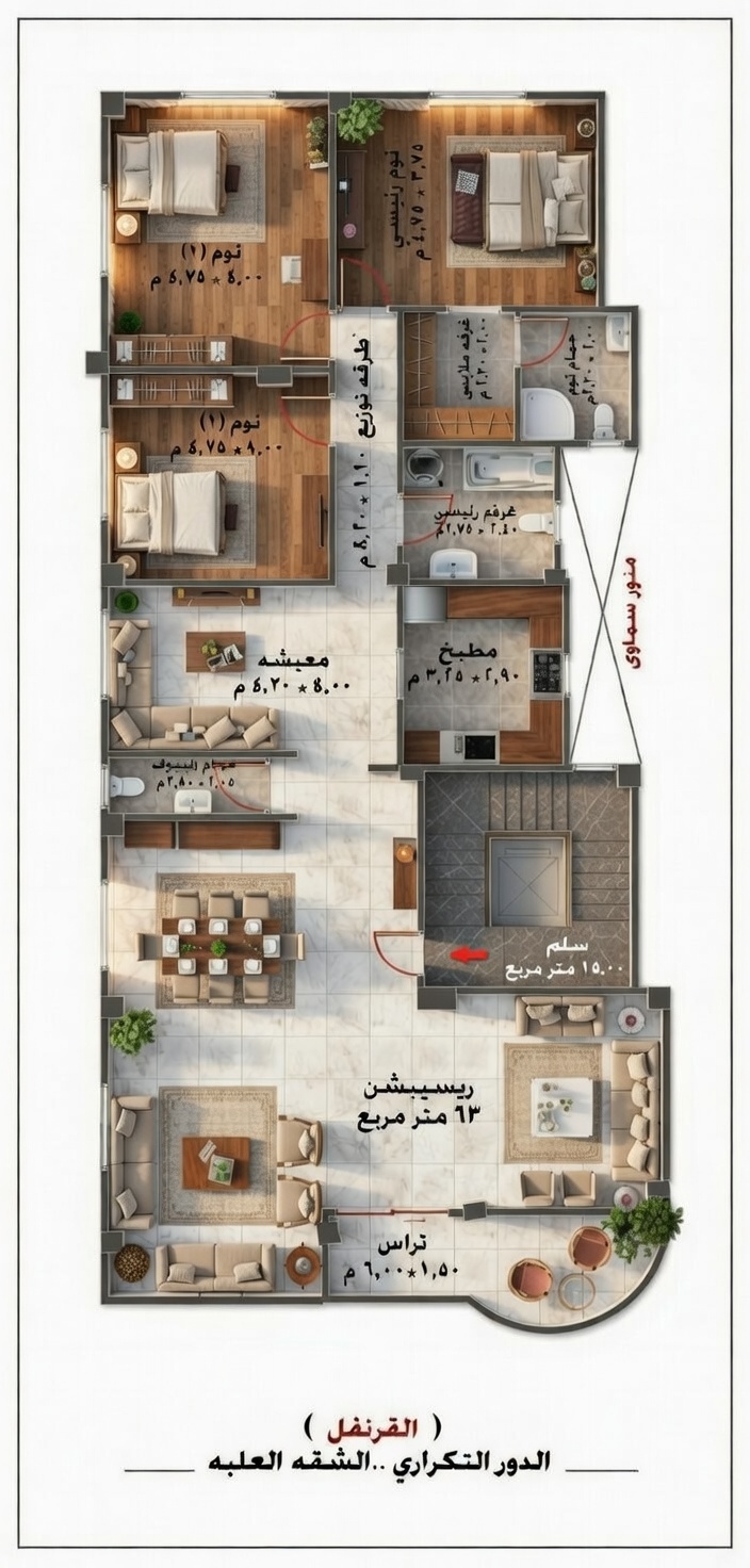 الحمامات: 3 (حمام ضيوف + حمام رئيسي + حمام الماستر)